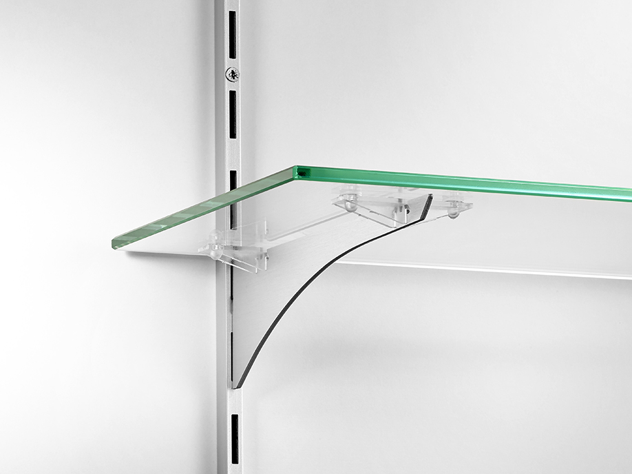 Les supports sont fabriqués à partir d’un alliage d’aluminium qui permet les finitions anodisées (naturel ou doré). Les cavaliers plastiques alliés à la tablette verre accentuent l’effet de transparence.